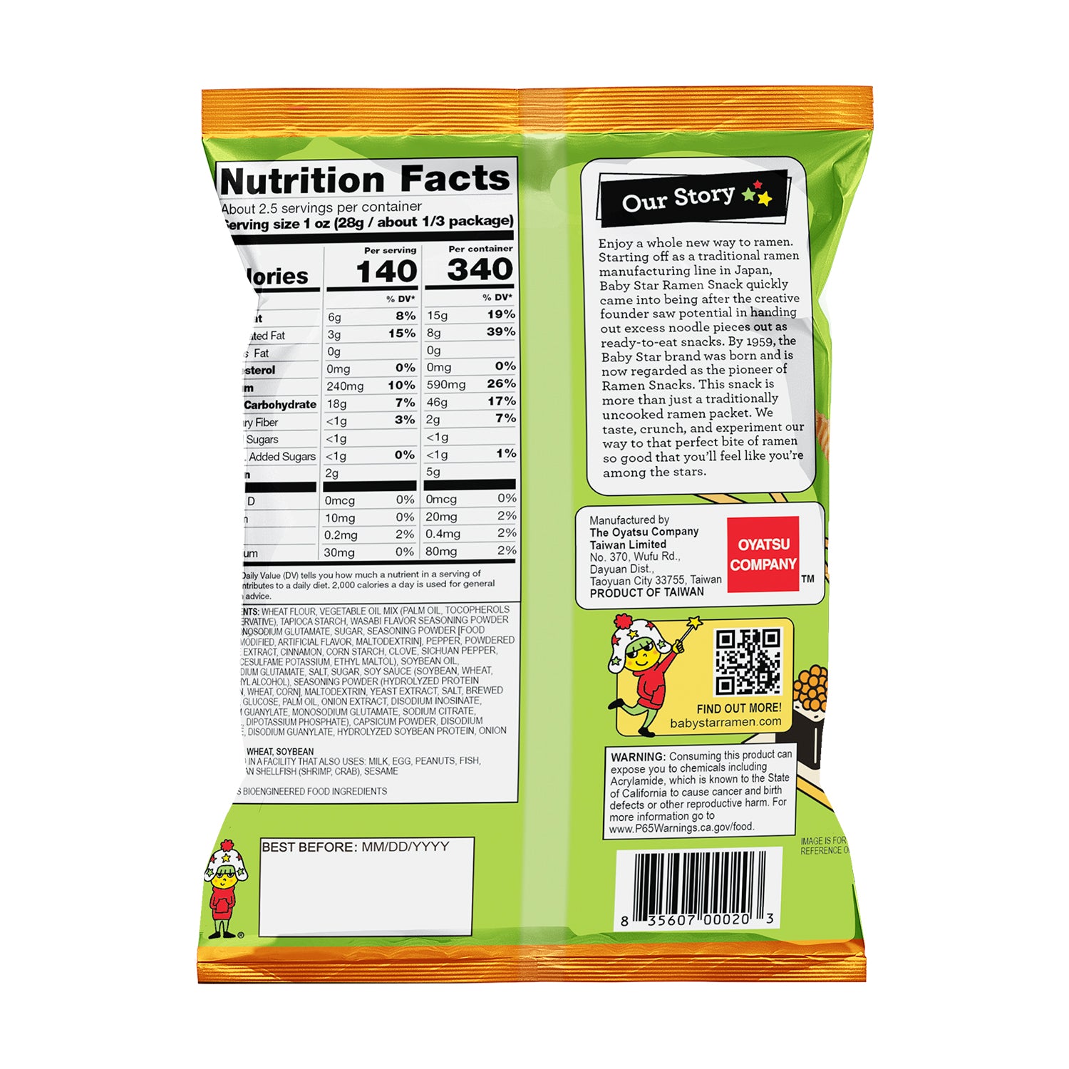 Experience the heat of our Wasabi ramen snack – an authentic, flavor-packed snack that delivers a satisfying kick with every bite. Whether you're a fan of fiery flavors or just looking to spice up your snack time, this crunchy snack will awaken your taste buds with its bold wasabi flavor.